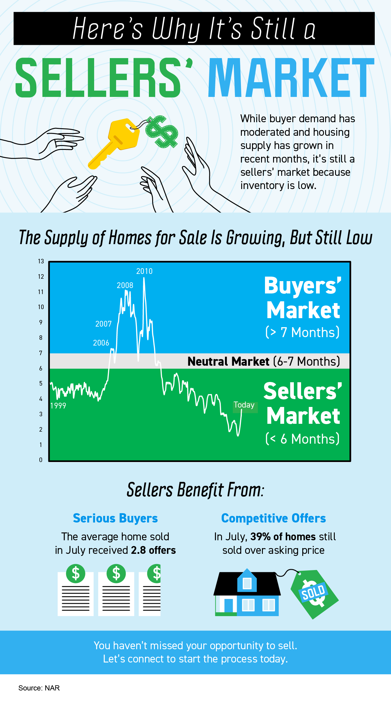 - While buyer demand has moderated and housing supply has grown in recent months, it’s still a sellers’ market because inventory is low.